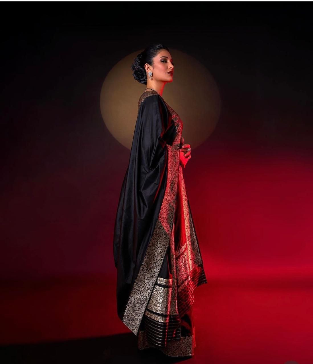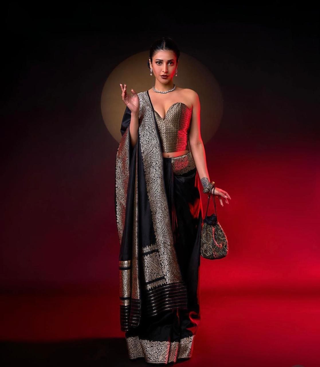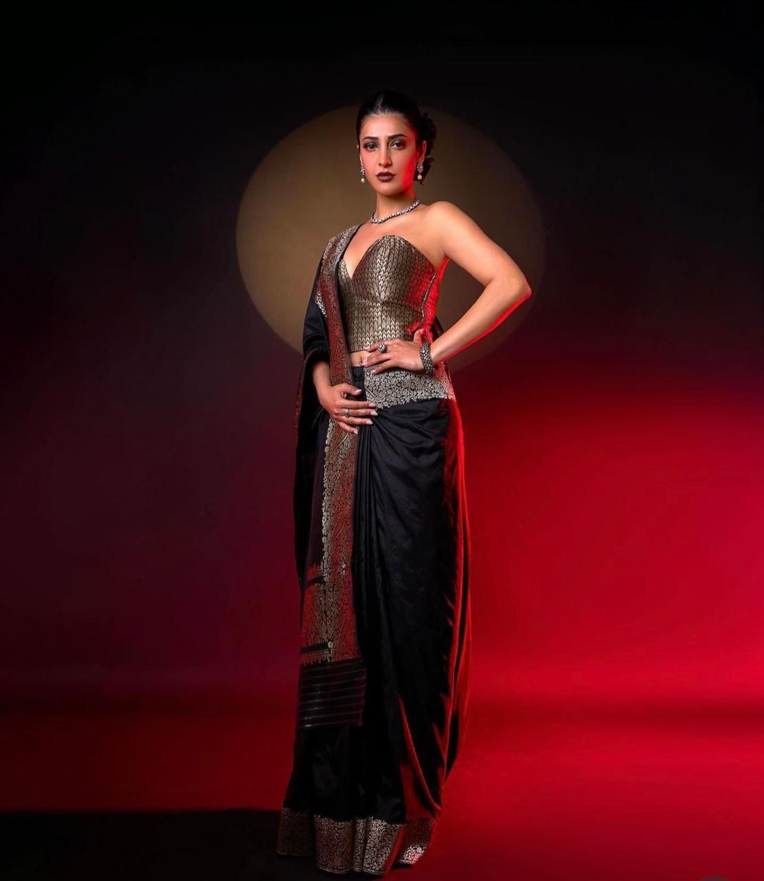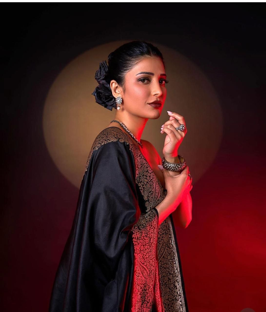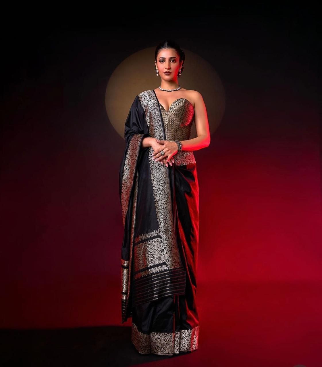 Shruti Haasan Designer Black Saree With Impressive Blouse Piece